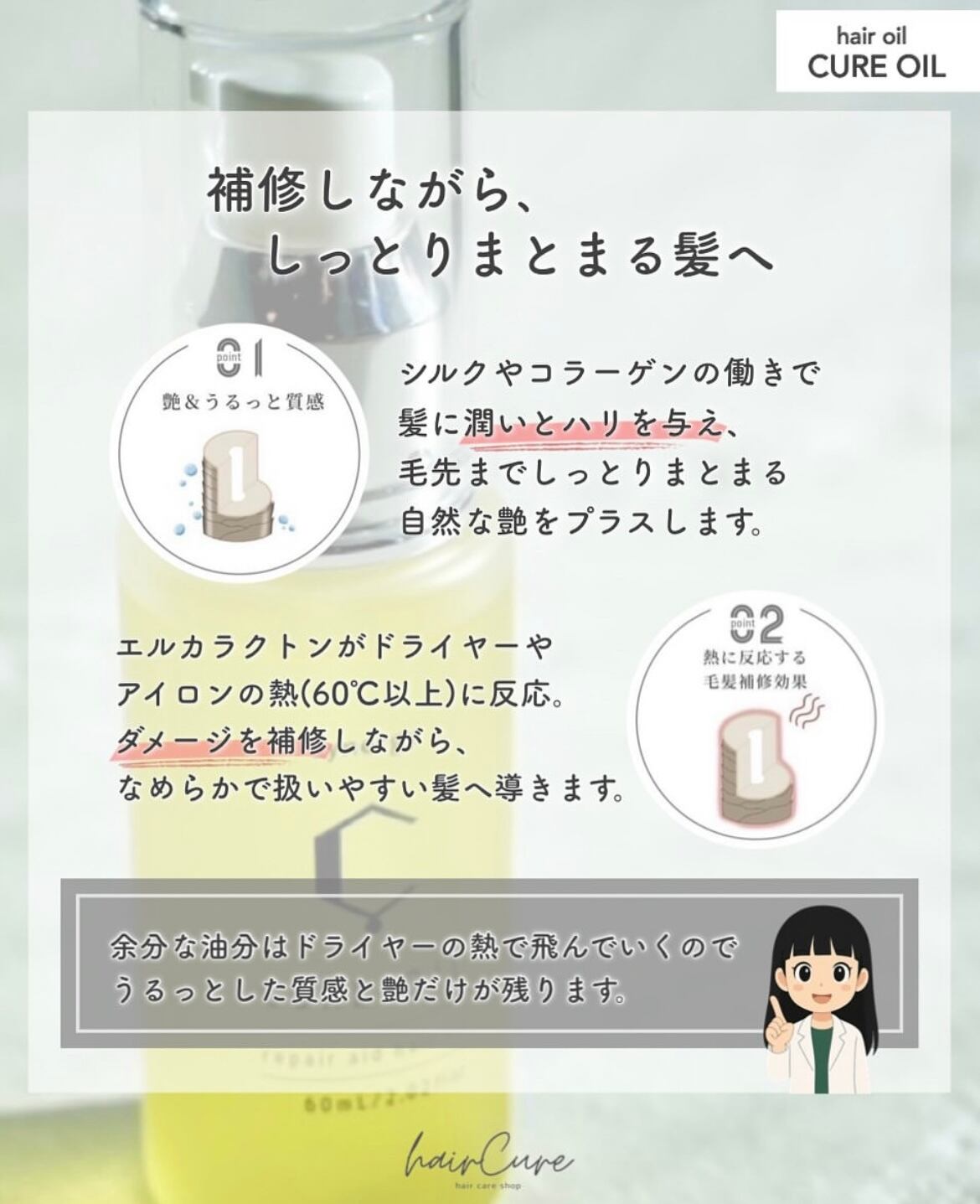 反応しキューティクルをはじめとするあらゆる毛髪修復をしていきます。余分な油分はドライヤーの熱で飛んでいくので艶とうるっとした質感だけが残ります。